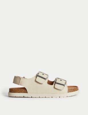 These footbed sandals are perfect for sunny days. The buckled two-strap design includes a third strap around the heel with an adjustable riptape fastening for quick and easy dressing. Lugs on the sole for grip.