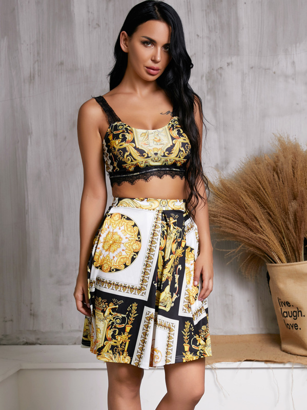 Glamaker расклешенная юбка и майка с графическим принтом и кружевной отделкой, null