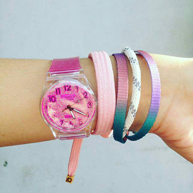 Swatch gliiter pink+gelang 55rb -diameter 3cm -tidak anti air -free box bantal -batrei cdngan
