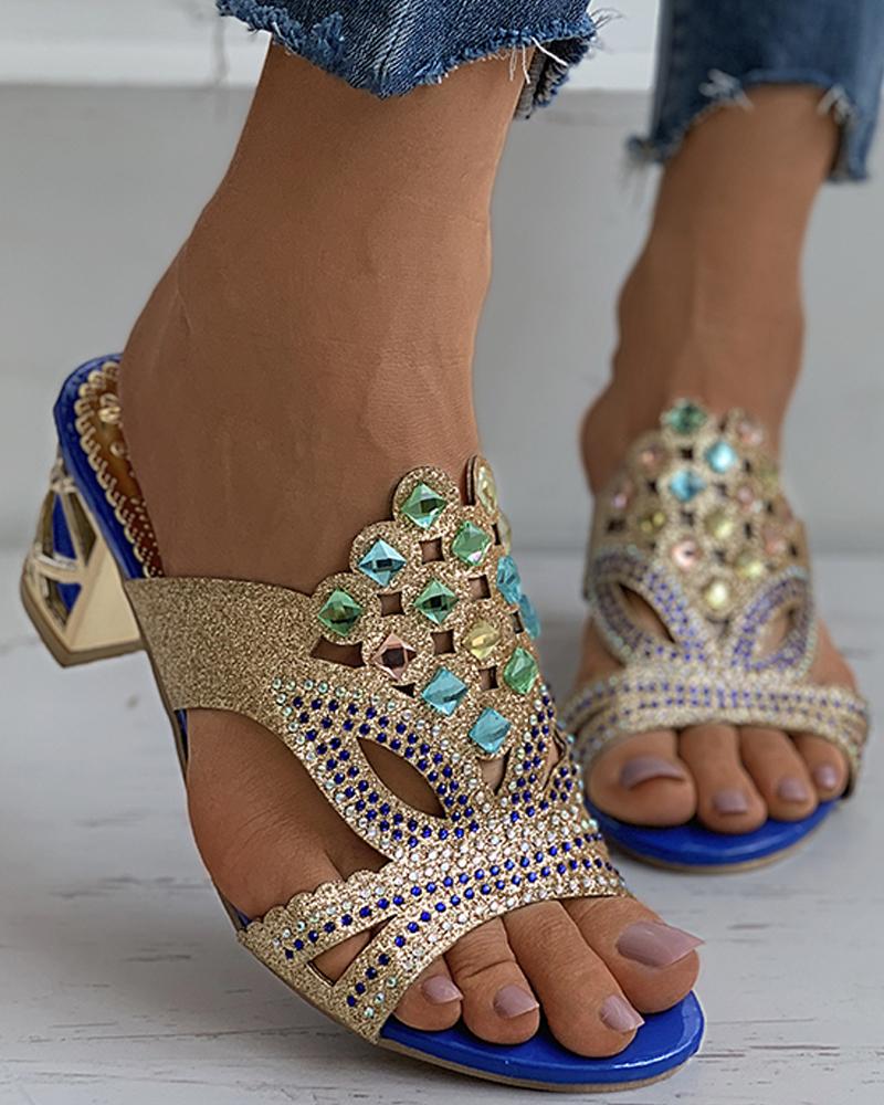 Glitter Rhinestone Cutout Chunky Heel, Blue