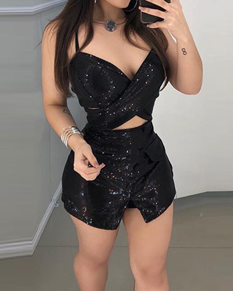 Glitter Sequins Cross Over Design Rompers, Black
