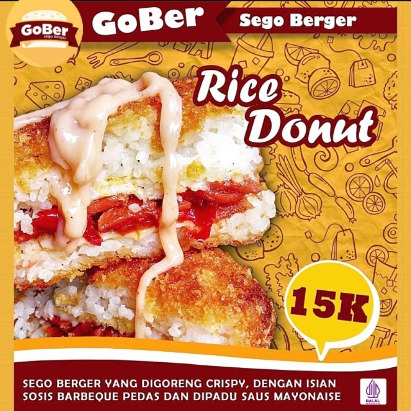 Gober Rice Donat dengan sensasi krispi diluarnya berisi potongan Sosis bumbu barbeque pedas & keju didalammnya , lalu di goreng krispi dengan tambahan saus Mayo pedas / Ori (optional)