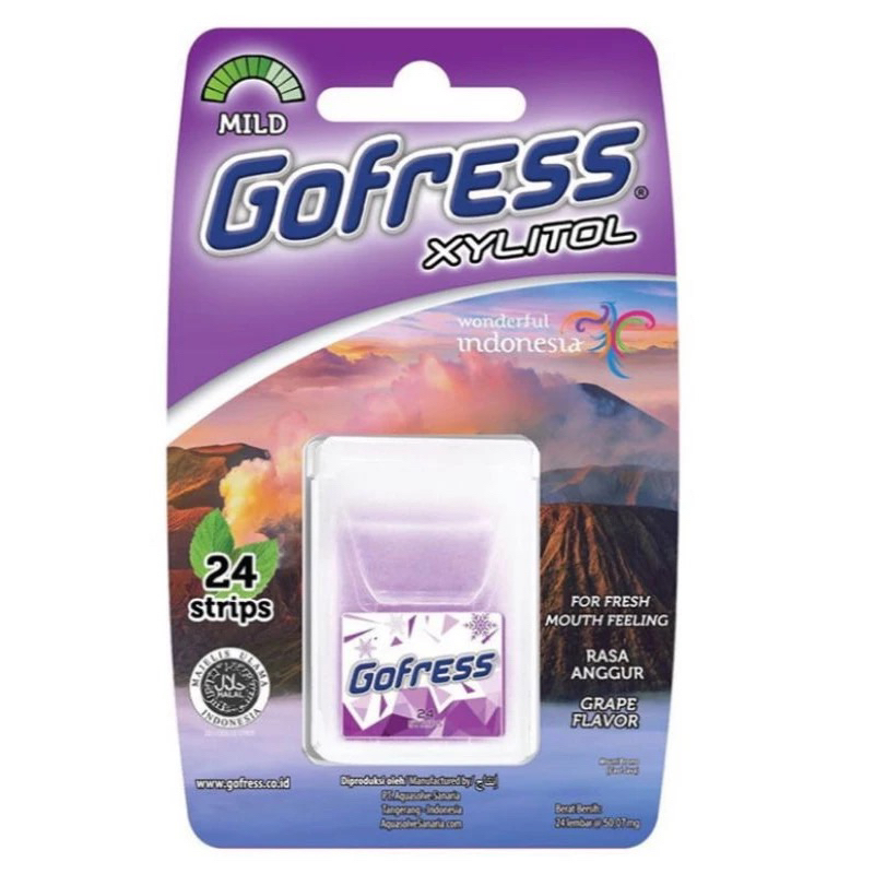 GOFRESS adalah permen lembar tipis pertama di Indonesia yang berfungsi mengatasi permasalahan di mulut seperti membunuh kuman dan virus, bau mulut, dan nafas tak segar.