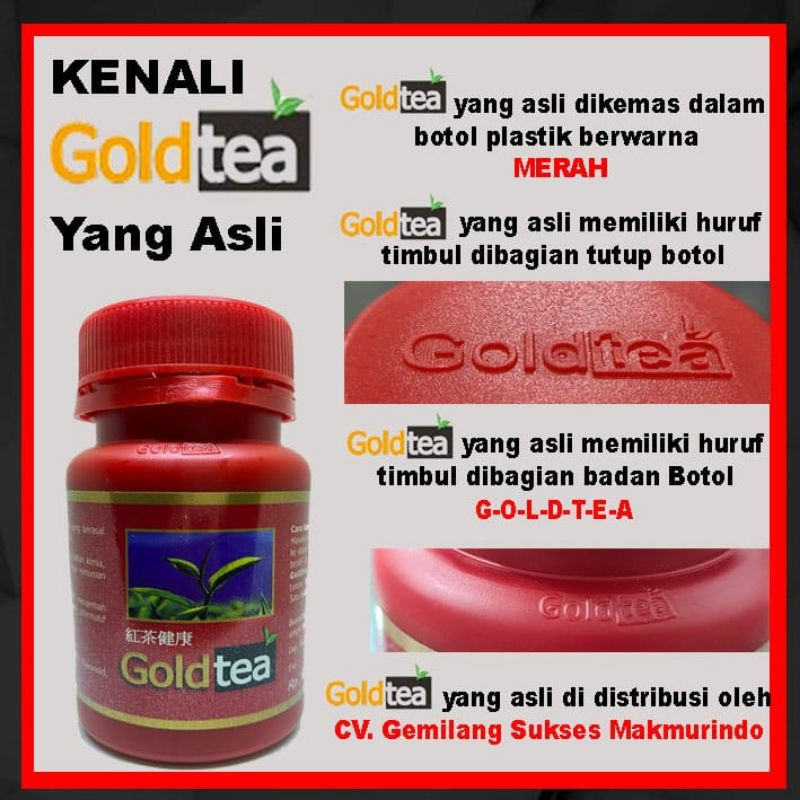 GOLD TEA Adalah produk herbal dari Teh Hitam yang berasal dari pucuk Camelia Chinensis . Goldtea merupakan teh hitam yang 100% berasal dari dua pucuk daun teh teratas, tanpa tambahan daun tua maupun ranting. Isi : 25 Gram Atasi berbagai macam penyakit Goldtea memiliki ukuran granul yang optimal dan kadar air yang rendah, sehingga dalam setiap kemasan akan berisi lebih banyak dan lebih tahan lama dalam penyimpanan. Goldtea merupakan hasil dari proses produksi yang teliti dan memenuhi standar keamanan pangan internasional HACCP (Hazard Analysis and Critical Control Points) sebagai wujud nyata kualitas teh hitam yang utama. Goldtea berwujud butiran teh yang berwarna lebih gelap serta lebih padat. Selain itu juga memiliki aroma yang segar dan wangi tanpa tambahan bahan apapun. Dengan kemurniannya, satu takaran Goldtea dapat dituang hingga tiga kali, membuat Goldtea lebih disukai konsumen serta lebih cepat terasa manfaatnya untuk kesehatan. Kandungan alami : Katekin, Polifenol, Tanin Theaflavin, Tanin Teaburigin, Flavonoid, , Vitamin K, Vitamin E, dll Manfaat : Melancarkan peredaran darah Menambah kesegaran badan Secara Tradisional sebagai pencegahan terhadap berbagai macam penyakit Cara Minum : Masukkan 1 sendok teh ke dalam 1 gelas (250 cc) tuangkan air panas Goldtea diminum hangat-hangat tanpa ditambah gula, madu susu dan lain-lain. Satu takaran goldtea bisa diminum sampai 3 kali. Usahakan untuk minum 4 6 kali sehari untuk menjaga kesehatan kita. DEPKES RI P-IRT No. 2103302011130