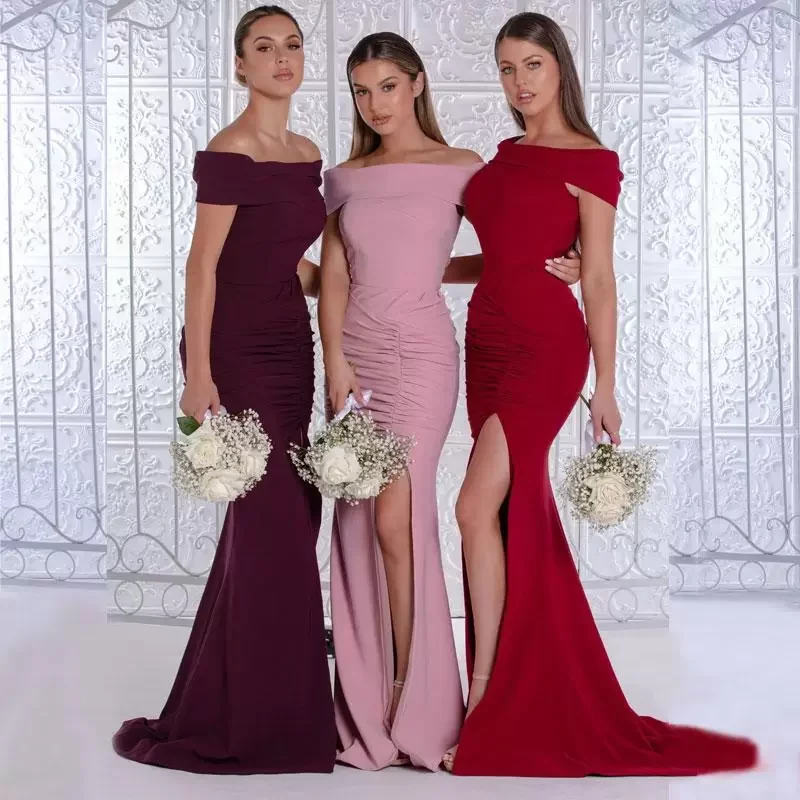 Charming Simple Mermaid Bridesmaid Dresses Off Shoulder Neck Pleated Side Split Country Style Maid Of Honor Gowns Свадебное плат