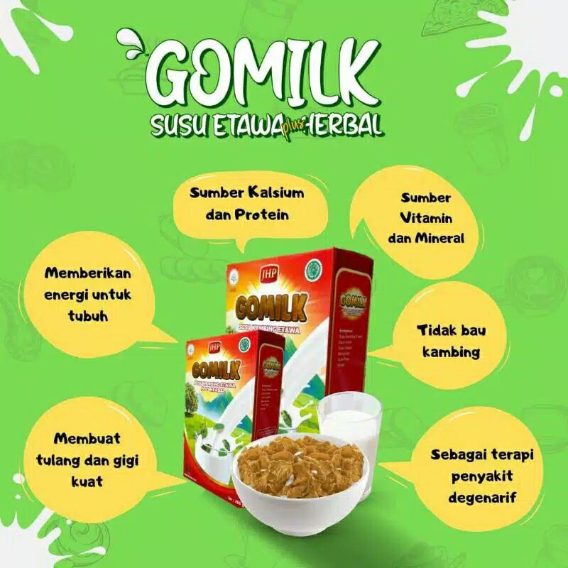 S & STROKE 9. Mengurangi ASAM URAT & KOLESTEROL 10. Aman Dikonsumsi BUMIL & BUSUI KEUNGGULAN Susu Kambing Etawa GOMILK : 1. Terdapat nutrisi yang terkandung dalam daun kelor, diantaranya : - 7 kali vitamin C dalam buah jeruk, - 4 kali vitamin A dalam wortel, - 4 kali kalsium dalam susu, - 3 kali kalium dalam pisang, - 2 kali protein yang terdapat dalam yoghurt ataau telur. 2. Baik dikonsumsi untuk anak-anak sampai dewasa. 3. Rasanya lebih LEZAT dan GURIH, sehingga disukai anak-anak. 4. Mengandung sedikit gula, sehingga tidak merusak gigi anak anda. 5. Aman untuk dikonsumsi bagi yang memiliki DIABETES. 6. TIDAK BAU AMIS CATATAN: Berat Bersih Susu 200gr/pcs Berat Kotor (Isi+Kotak Kemasan+Packing)= 250gr/pcs > #gomilk #gomilksusukambing #susukambingetawagomilk #susukambinggomilk