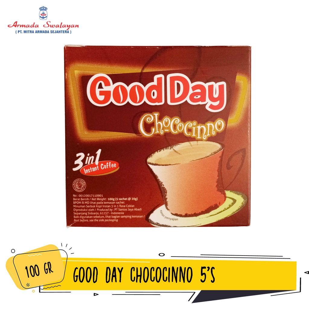 Good Day merupakan kopi instan yang terbuat dari perpaduan kopi, gula, dan krimer dalam satu saset. Rasa Good Day yang istimewa sangat pas dinikmati dalam setiap momen hangatmu bersama teman atau orang kesayangan. Kemasannya yang praktis memudahkan Anda untuk membawanya kemanapun Anda berada.