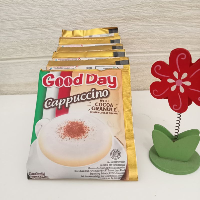 Good Day Cappuccino 10 X 25gr merupakan kopi bubuk yang terbuat dari biji kopi pilihan. Varian ini menghasilkan kopi yang harum dan lebih enak. Jenis Produk : Kopi Jumlah Produk : 1 renceng (10pcs) Berat : 25gr BPOM : MD 267013061005 Halal MUI Diproduksi di Indonesia ● Cara Penyajian : Tuangkan satu sendok makan ke dalam cangkir kemudian seduh dengan air mendidih 200 ml dan kopi ini siap disajikan. ● Komposisi : kopi instan, gula, krim nabati, coklat bubuk, perasa cappuccino"