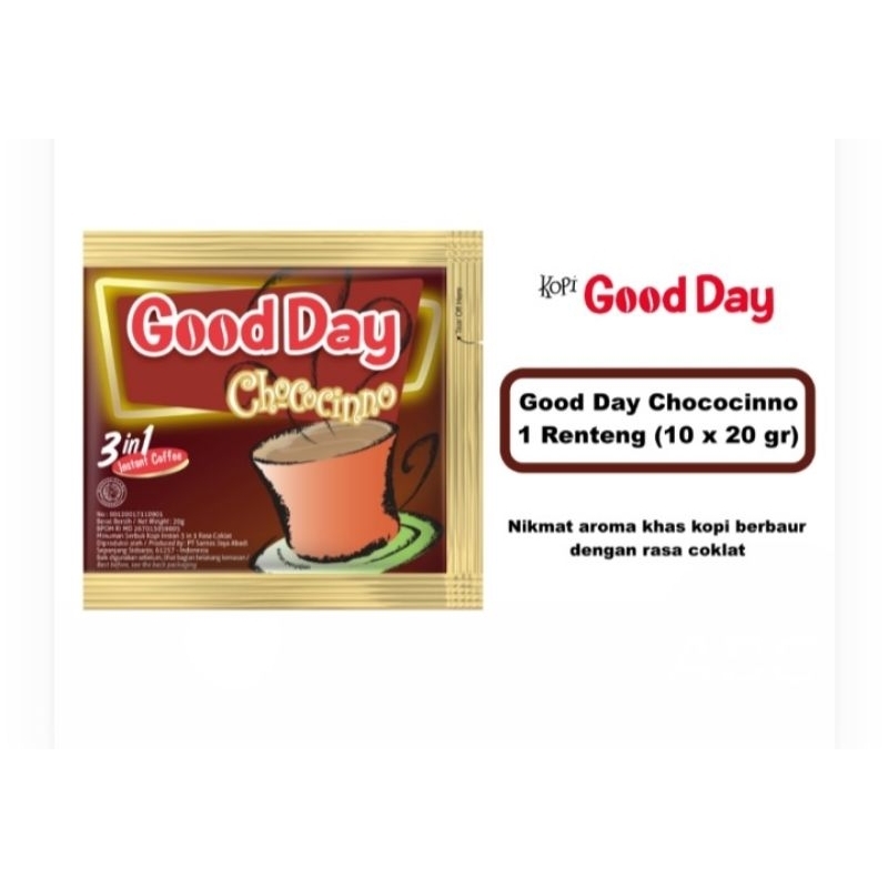 Good Day Chococinno Kopi Instant 3 in 1 lengkap dengan perpaduan rasa coklat yang nikmat Cocok untukmu menemani gaulmu agar lebih penuh rasa