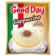 Good Day Minuman Kopi Originale Cappuccino adalah kopi yang terbuat dari biji kopi pilihan, yang diolah secara modern dengan teknik khusus, sehingga menghasilkan minuman kopi dengan rasa klasik yang nikmat dan aroma kopi yang khas. Perpaduan antara susu, kopi, menghasilkan minuman kopi dengan rasa unik perpaduan kopi dengan kopi susu. Memiliki aroma kopi yang harum dengan tekstur kopi yang creamy, serta rasa manis yang pas. Rasa dan aroma kopi yang nikmat dapat membantu membangkitkan semangat saat beraktivitas. Akan lebih nikmat jika dinikmati dalam kondisi dingin.