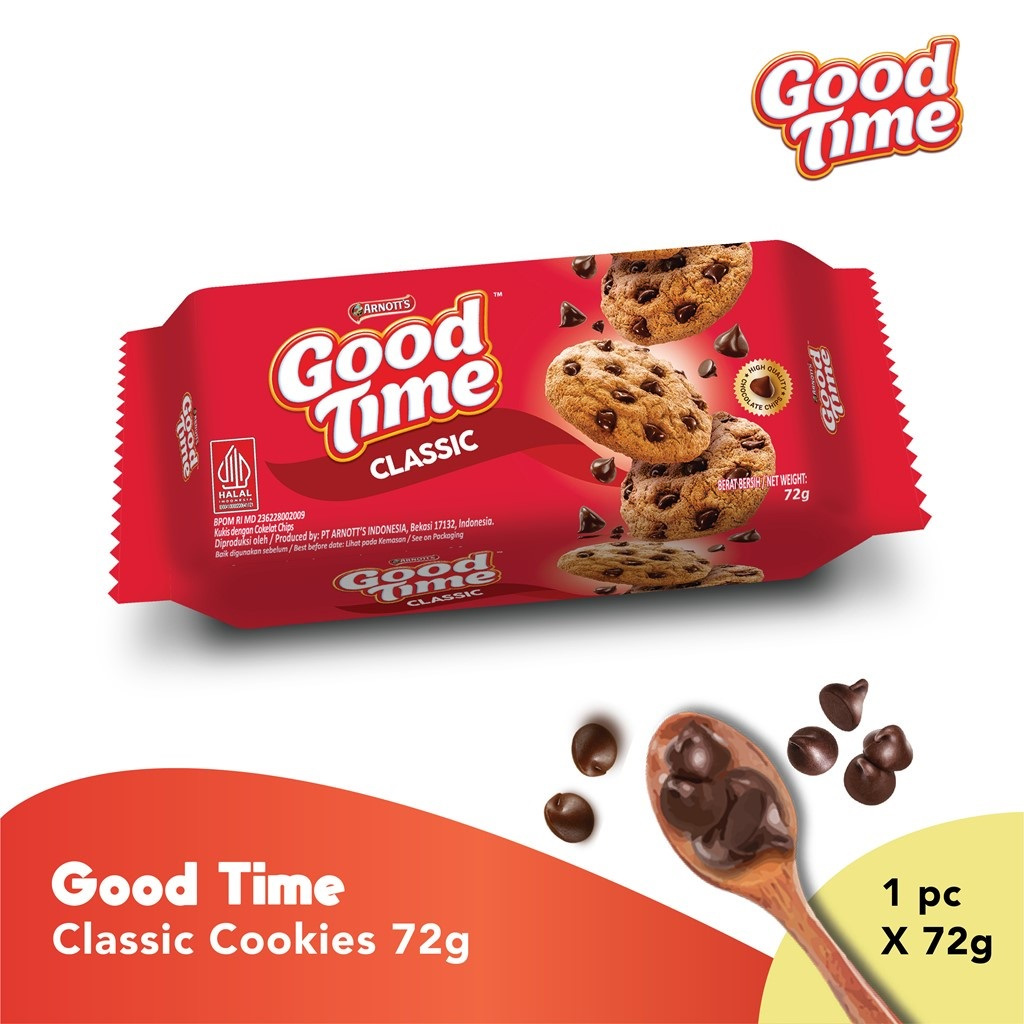 Good Time Classic Chocochips Cookies 72 gr merupakan snack biskuit persembahan GOOD TIME yang sangat renyah dan enak. Biskuit ini bertabur coklat lezat yang menambah kenikmatan setiap gigitanya. Sangat cocok menjadi teman disaat bersantai.