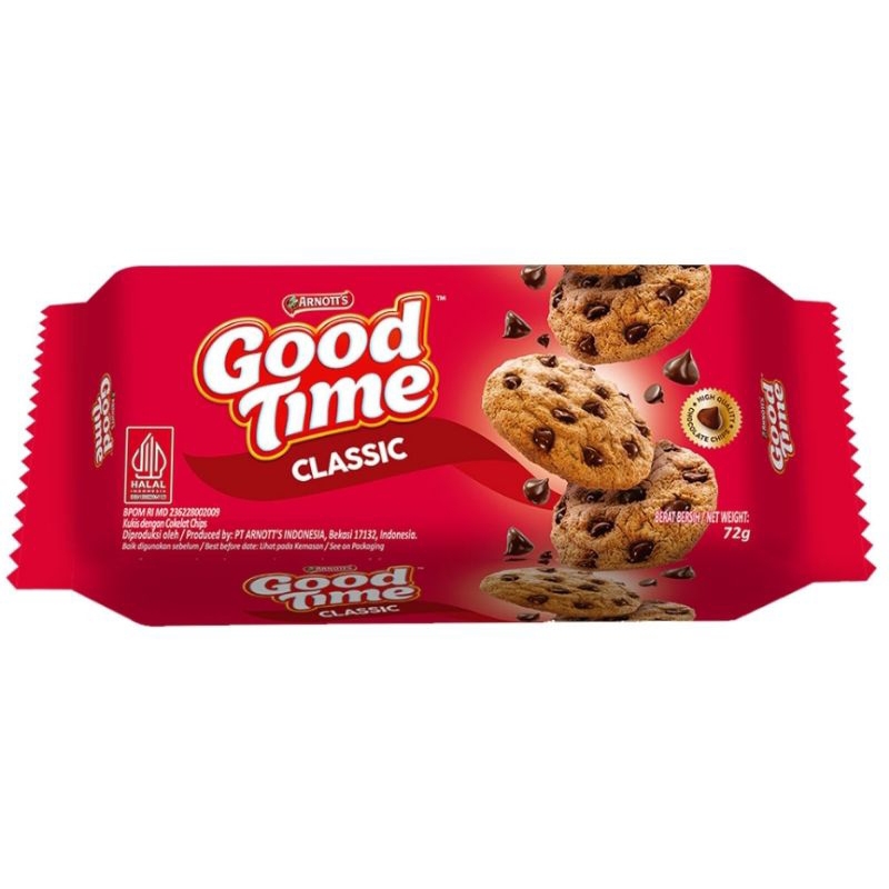 Good Time Cookies Classic 72 g adalah varian Good Time Cookies rasa coklat klasik. Kerenyahan kue kering berkualitas ditambah dengan taburan choco chips rasa coklat yang pekat akan memberikan pengalaman makan yang istimewa untuk Anda dan keluarga. Perpaduan renyah dan manisnya menjadikan Good Time Cookies Classic pilihan yang tepat dalam berbagai kesempatan. Dengan kemasan siap saji 72 gram, sangat cocok menjadi teman saat piknik, menonton TV, bermain musik, dan bermain di halaman rumah. Kue cookies ini juga dapat menjadi teman minum kopi, teh, dan susu kesukaan Anda. Rasakan rasa coklat klasiknya dan warnai hari-hari Anda dan keluarga dengan Good Time Cookies Classic.