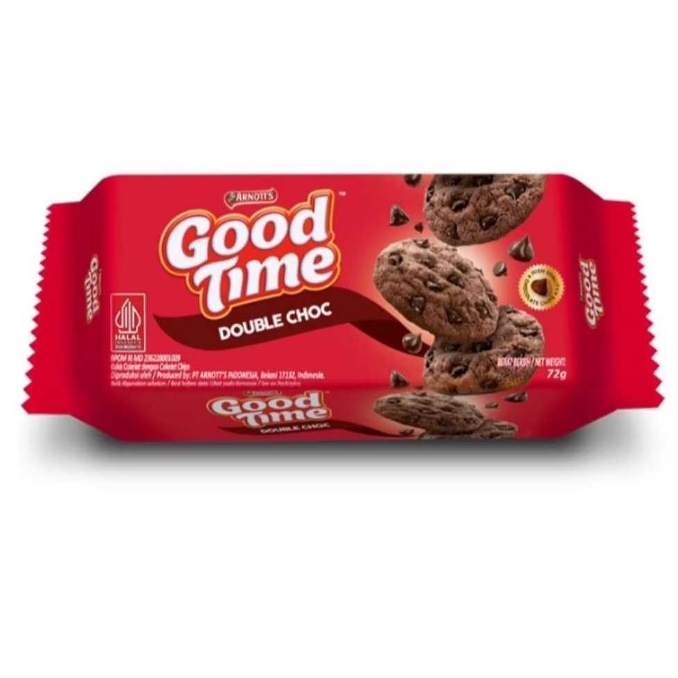 Good Time Cookies Double Choc 72 g adalah produk Good Time Cookies yang kini hadir dengan varian rasa coklat yang berlipat. Kerenyahan kue kering berkualitas ditambah dengan taburan choco chips rasa coklat yang lebih banyak akan memberikan pengalaman makan yang istimewa untuk Anda dan keluarga. Perpaduan renyah dan manisnya menjadikan Good Time Cookies Double Chocolate pilihan yang tepat dalam berbagai kesempatan. Dengan kemasan siap saji 72 gram, sangat cocok menjadi teman saat piknik, menonton TV, bermain musik, dan bermain di halaman rumah. Kue cookies ini juga dapat menjadi teman minum kopi, teh, dan susu kesukaan Anda. Rasakan rasa coklat berlipatnya dan warnai hari-hari Anda dan keluarga dengan Good Time Cookies Double Chocolate.