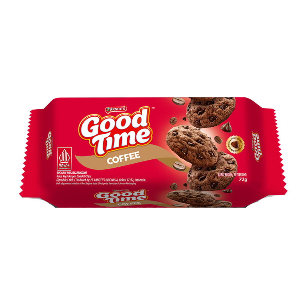 adalah varian Good Time Cookies rasa kopi. Nikmatnya kopi yang manis wangi dan renyah ditambah dengan taburan choco chips coklat yang pekat akan memberikan pengalaman makan yang istimewa untuk Anda dan keluarga. Perpaduan renyah dan manisnya menjadikan Good Time Cookies Coffee pilihan yang tepat dalam berbagai kesempatan. Dengan kemasan siap saji 72 gram, sangat cocok menjadi teman saat piknik, menonton TV, bermain musik, dan bermain di halaman rumah. Kue cookies ini juga dapat menjadi teman minum kopi, teh, dan susu kesukaan Anda. Rasakan nikmatnya kopi dan warnai hari-hari Anda dan keluarga dengan Good Time Cookies Coffee.