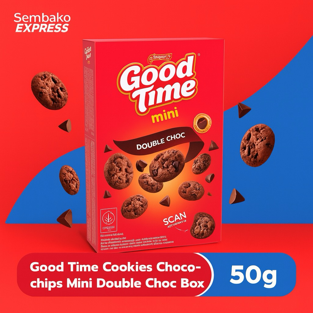 Good Time Cookies Mini Double Choc Box 50g hadir dengan choco chips melimpah, cocok sebagai camilan premium untuk keluarga, teman, atau dinikmati sendiri.