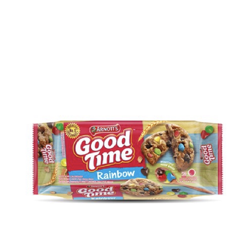 Good Time Rainbow Chocochips Cookies 72 gr adalah varian Good Time Cookies rasa cokelat yang berlipat. Terbuat dari bahan-bahan berkualitas dengan standar kualitas dari Arnott's. Kerenyahan kue kering berkualitas ditambah dengan taburan choco chips berwarna-warni akan memberikan pengalaman makan yang istimewa untuk Anda dan keluarga. Perpaduan renyah dan manisnya menjadikan Good Time Rainbow Chocochips Cookies pilihan yang tepat dalam berbagai kesempatan. Kue cookies ini juga dapat menjadi teman minum kopi, teh, dan susu kesukaan Anda.