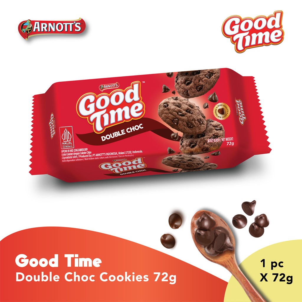 Good Time Double Choc Chocochips Cookies 72gr merupakan snack biskuit persembahan GOOD TIME yang sangat renyah dan enak. Biskuit coklat yang ditaburi oleh coklat lezat yang menambah kenikmatan setiap gigitanya. Sangat cocok menjadi teman disaat bersantai. BPOM MD 236228001009 Shelf Life 12 months