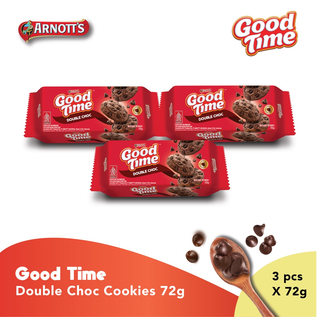 Biskuit renyah rasa cokelat bertabur chococips lezat. Terbuat dari bahan berkualitas dan rasa yang lezat sehingga disukai jutaan keluarga di Indonesia. Hadirkan kebahagiaan bagi momen bersama keluarga anda dengan biskuit Good Time favorit keluarga.
