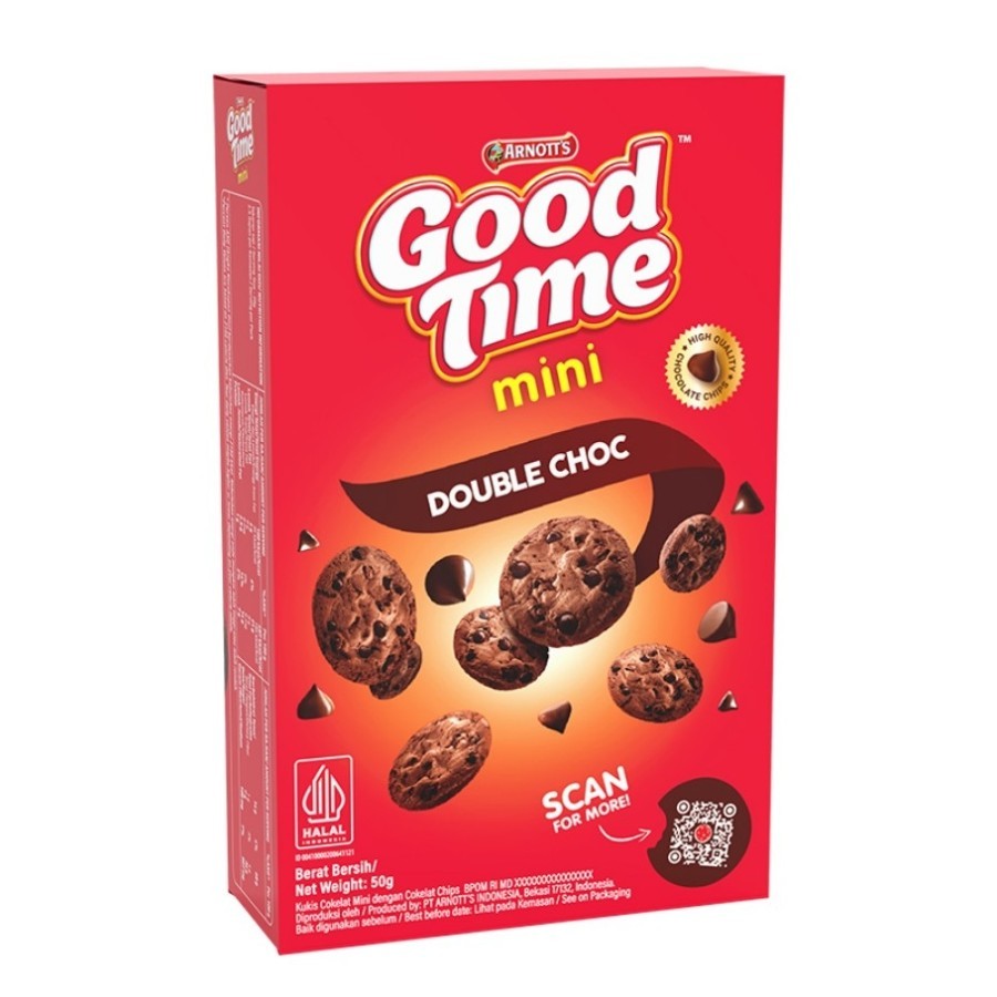 Produk Good Time Cookies yang kini hadir dengan varian rasa coklat yang berlipat. Kerenyahan kue kering berkualitas ditambah dengan taburan choco chips rasa coklat yang lebih banyak akan memberikan pengalaman makan yang istimewa untuk Anda dan keluarga. Perpaduan renyah dan manisnya menjadikan Good Time Cookies Double Chocolate pilihan yang tepat dalam berbagai kesempatan. Dengan kemasan box isi 50 gram sangat cocok dibawa kemana-mana karena praktis.