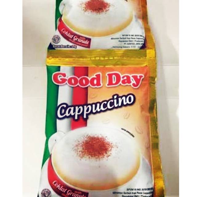 Mau santai atau lagi belajar bareng gank tapi pengen tetap berasa gaul? Cobain Good Day Cappuccino. Bikin kamu semangat sebarin ide baru, happy terus 'n makin gaul. Kopi instant semangat? Ya kopi Good Day! Karena hidup banyak rasa, kopi Good Day punya banyak pilihan rasa untuk harimu!
