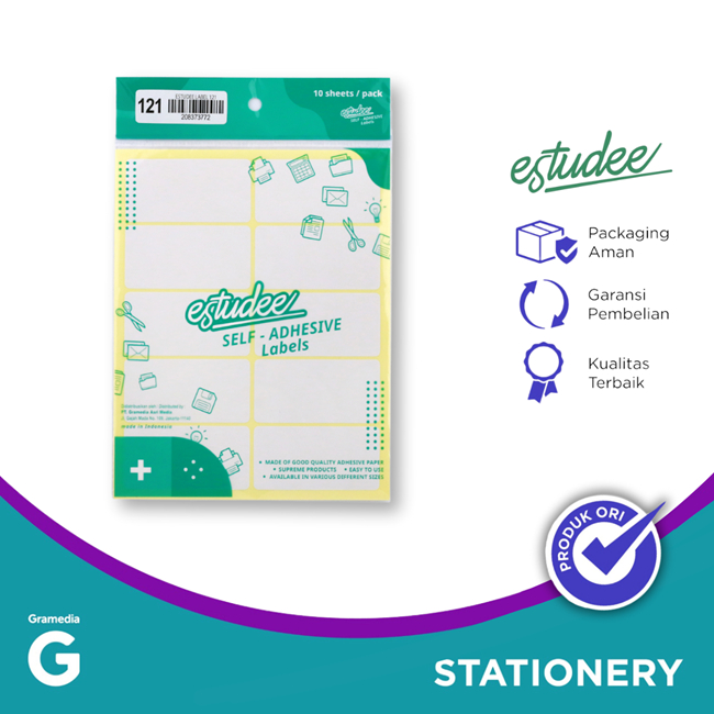Stiker label Estudee tersedia ukuran 103, 121, 107, 99, 108, 109, 101, 112, 102, 123, 104, 127, 100, 105, 125, 120, 124, 126, 113, 111, 110.