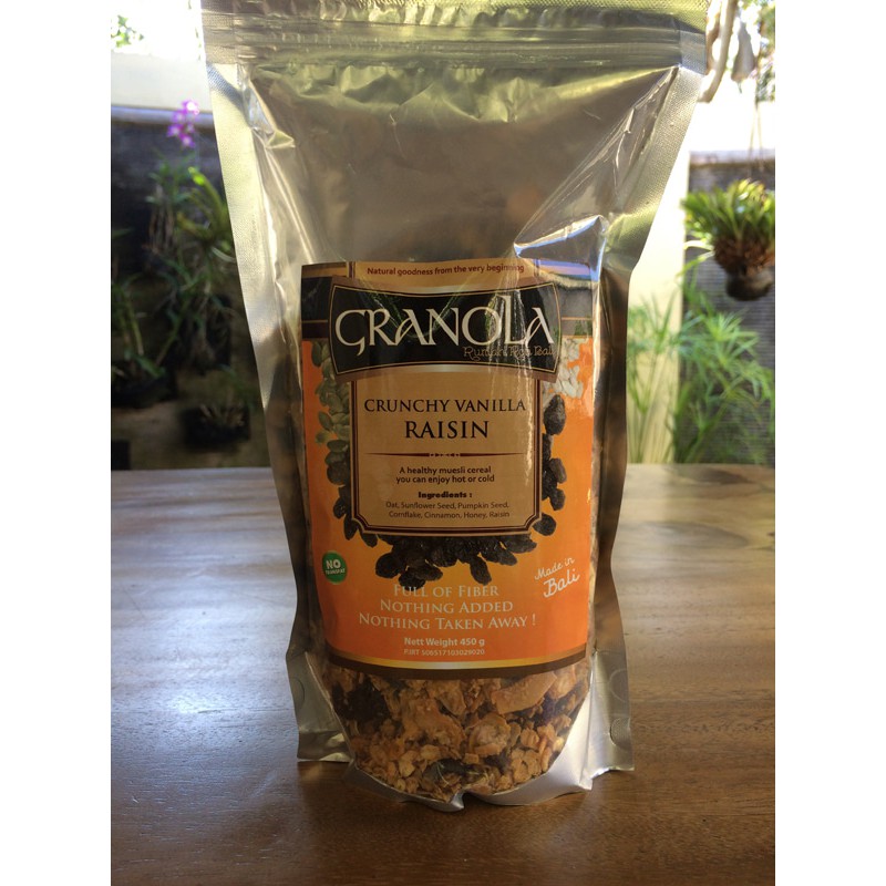Ingredients: Oat, Sunflower Seed, Pumpkin Seed, Cornflake, Cinnamon, Honey, Raisin No Transfat Berat nett: 450 gram Made in Bali Cara penyajian: Campur granola dengan susu atau yogurt Dapat menambahkan gula atau potongan buah segar