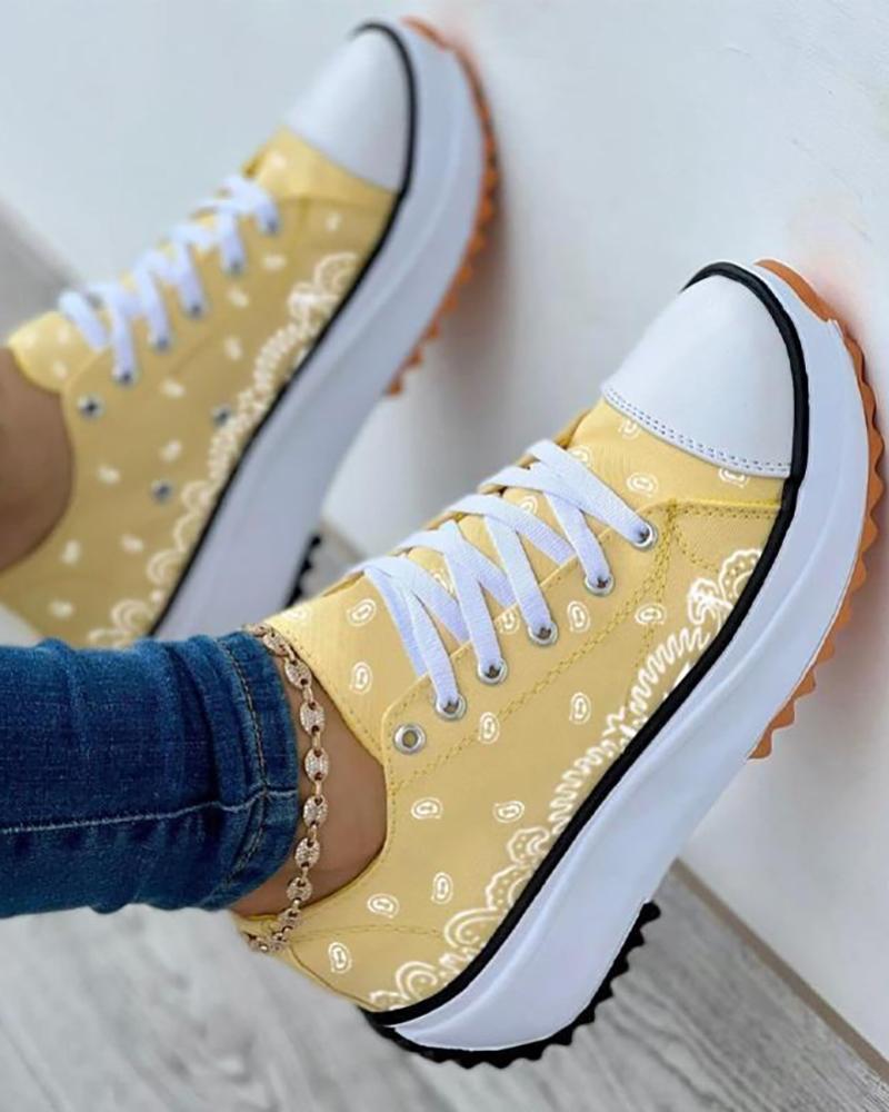 Graphic Pattern Lace-Up Front Sneakers, Yellow