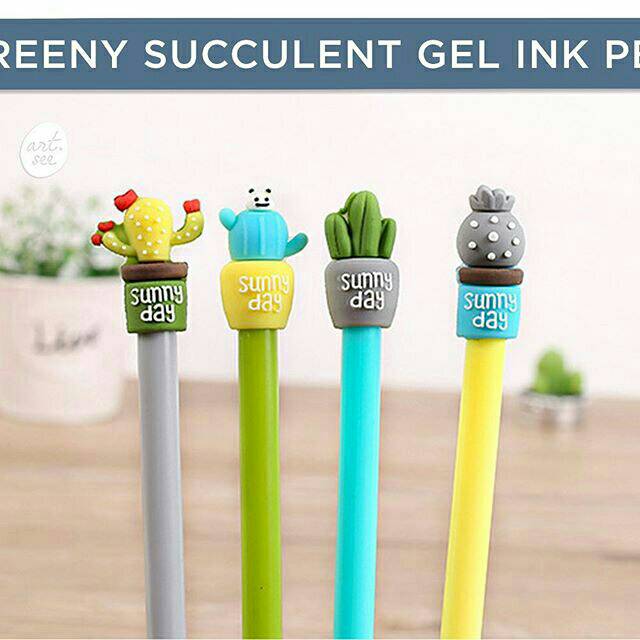 ------------------------------------------ Seri pena terbaru Greeny Succulent Gel Ink Penyang memiliki hiasan succulent yang menggemaskan dan berwarna-warni. Pen ini mempunyai isi tinta yang berwarna hitam serta memiliki tinta berbasis gel. Yuk, lengkapi koleksi pulpen mu!