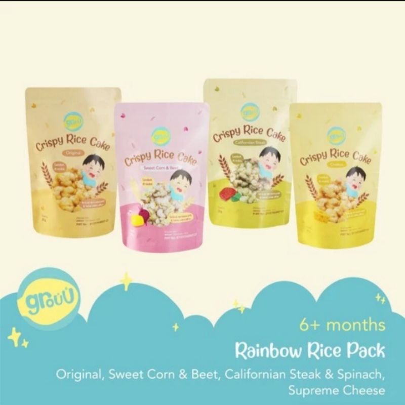 Grouu Crispy Rice Cake merupakan camilan sehat yang terbuat dari beras pilihan sehingga aman dikonsumsi untuk si kecil dan seluruh keluarga di sepanjang hari!