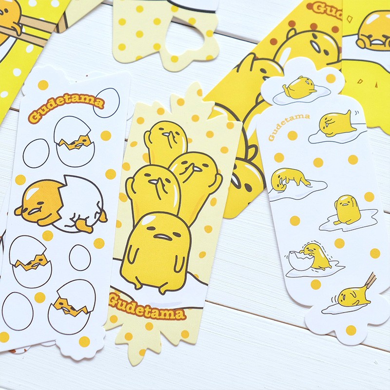 Kamu dapat melihat tingkah lucu Gudetama dalam 12 pembatas buku dengan bentuk bervariasi.