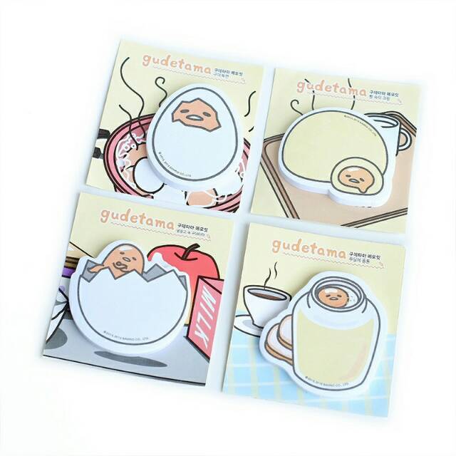 Catatan tempel (sticky notes) dengan karakter utama Gudetama (dari bahasa Jepang gude gude: malas, dan tamago: telur). Si karakter Sanrio yang terinspirasi dari telur ayam ini selalu terlihat mengantuk dan tidak berenergi. Lucu dan menggemaskan!