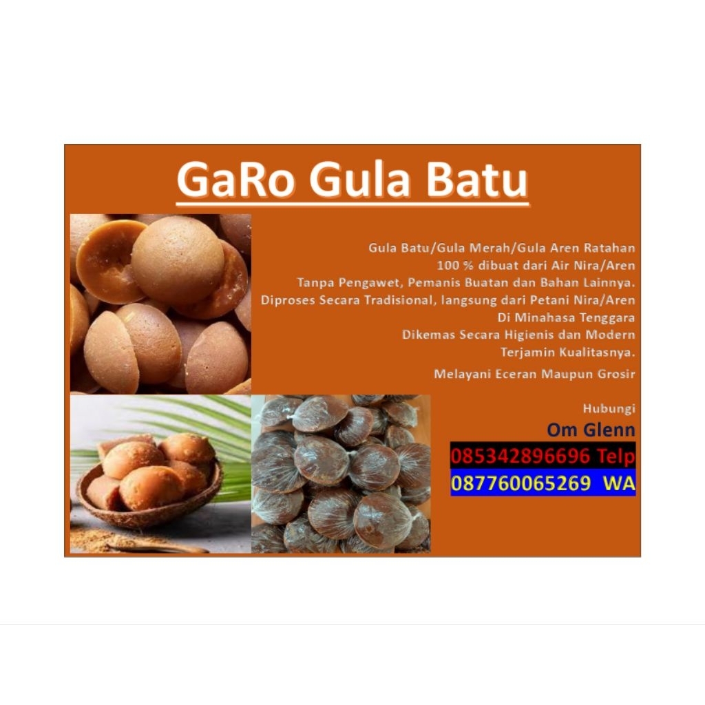 Gula batu Gula Merah Gula Aren Asli dari Ratahan Minahasa Tenggara, Manis tanpa tambahan bahan campuran lain 100% dari air Nira, langsung dari petani gula Minahasa Tenggara diproses secara tradisional dan dikemas secara higienis dan modern terjamin kualitasnya