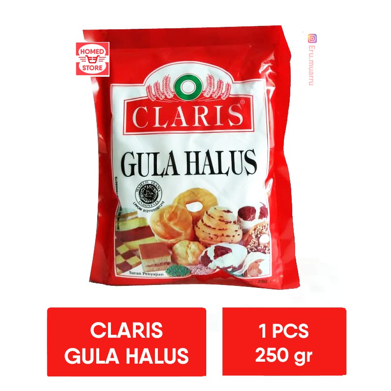 Claris Gula Halus , berat bersih 250 gram kemasan plastik dan di pack dengan kardus dalam pengiriman . Biasa digunakan untuk pemanis dalam pembuatan kue atau sebagainya.