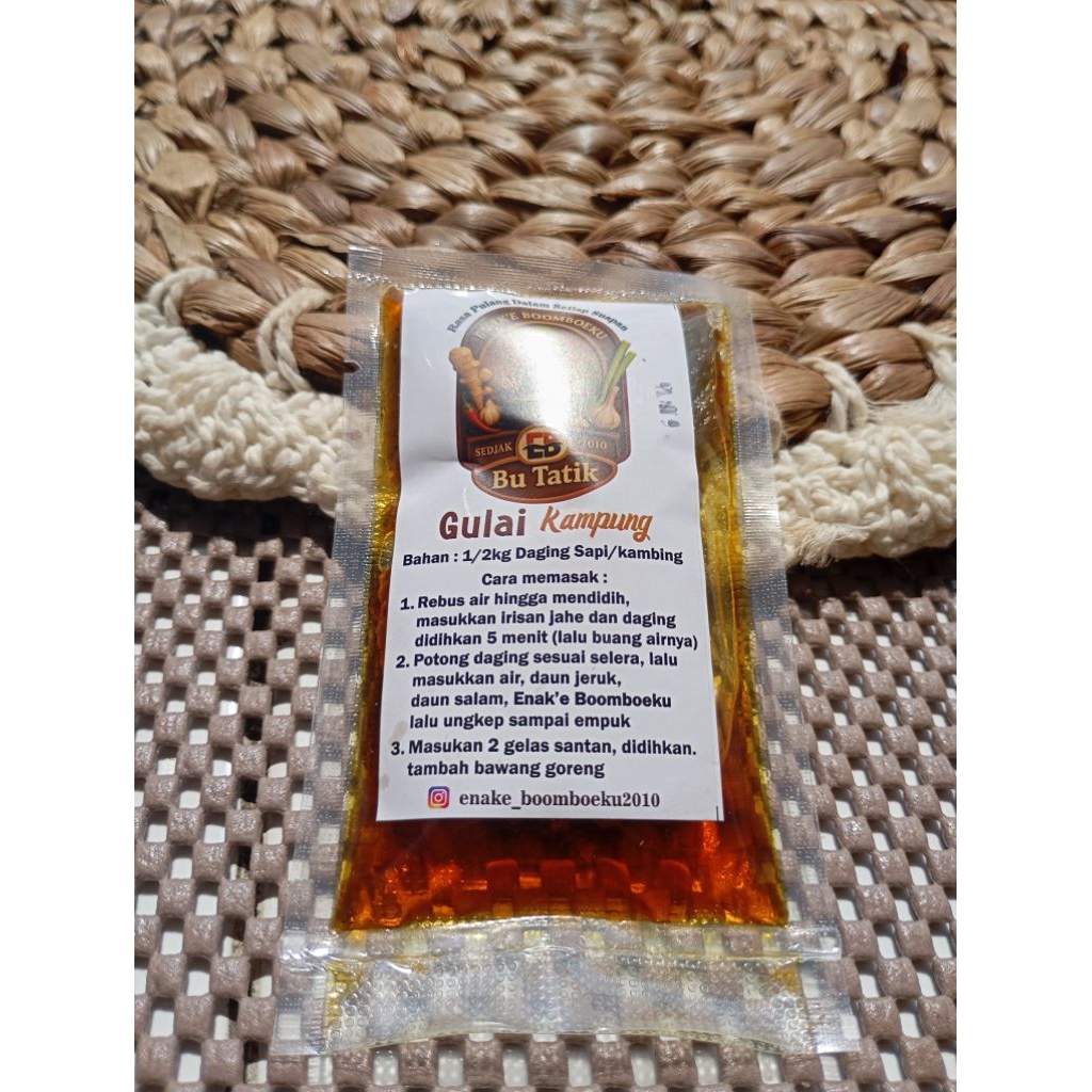Gulai yang harum, gurih, dan berbumbu pekat kini bisa kamu hadirkan di dapur sendiri—tanpa harus repot meracik dari nol. Bumbu Gulai dari Enak’e Boomboeku diramu dari warisan resep Ibu Tatik, yang telah disempurnakan puluhan tahun untuk menghadirkan rasa gulai yang nendang di lidah dan menenangkan di hati tanpa rasa enek.