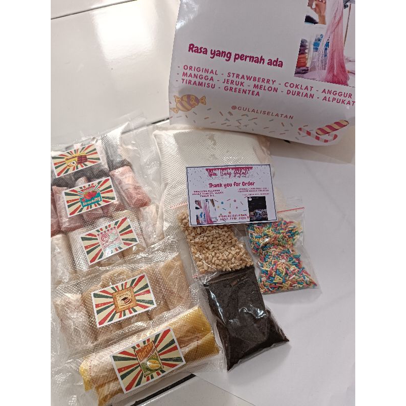 Terdiri dari 5 rasa gulali (masing2 5 pcs) total 25 pcs + tepung + topping.