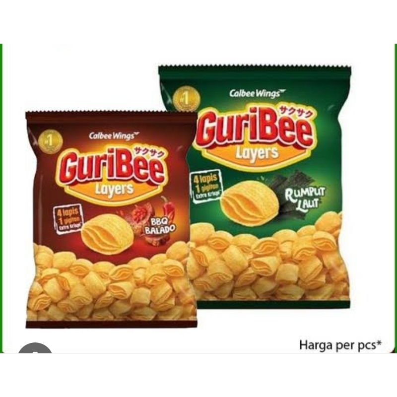Guribee rumput laut 16gram merupakan snack terbaru dari calbee wings dengan sensasi keripik kentang asli dengan taburan rumput laut yang nikmat dan gurih.