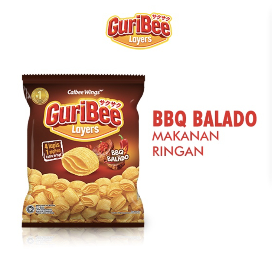 Guribee BBQ Balado merupakan snack terbaru dari Calbee Wings dengan sensasi kerpik kentang asli dengan taburan bumbu BBQ yang enak dan gurih