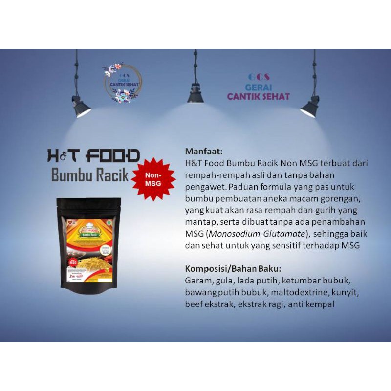 H&T Food Bumbu Racik Non MSG terbuat dari rempah-rempah asli dan tanpa bahan pengawet. Paduan formula yang pas untuk bumbu pembuatan aneka macam gorengan, yang kuat akan rasa rempah dan gurih yang mantap, serta dibuat tanpa ada penambahan MSG (Monosodium Glutamate)
