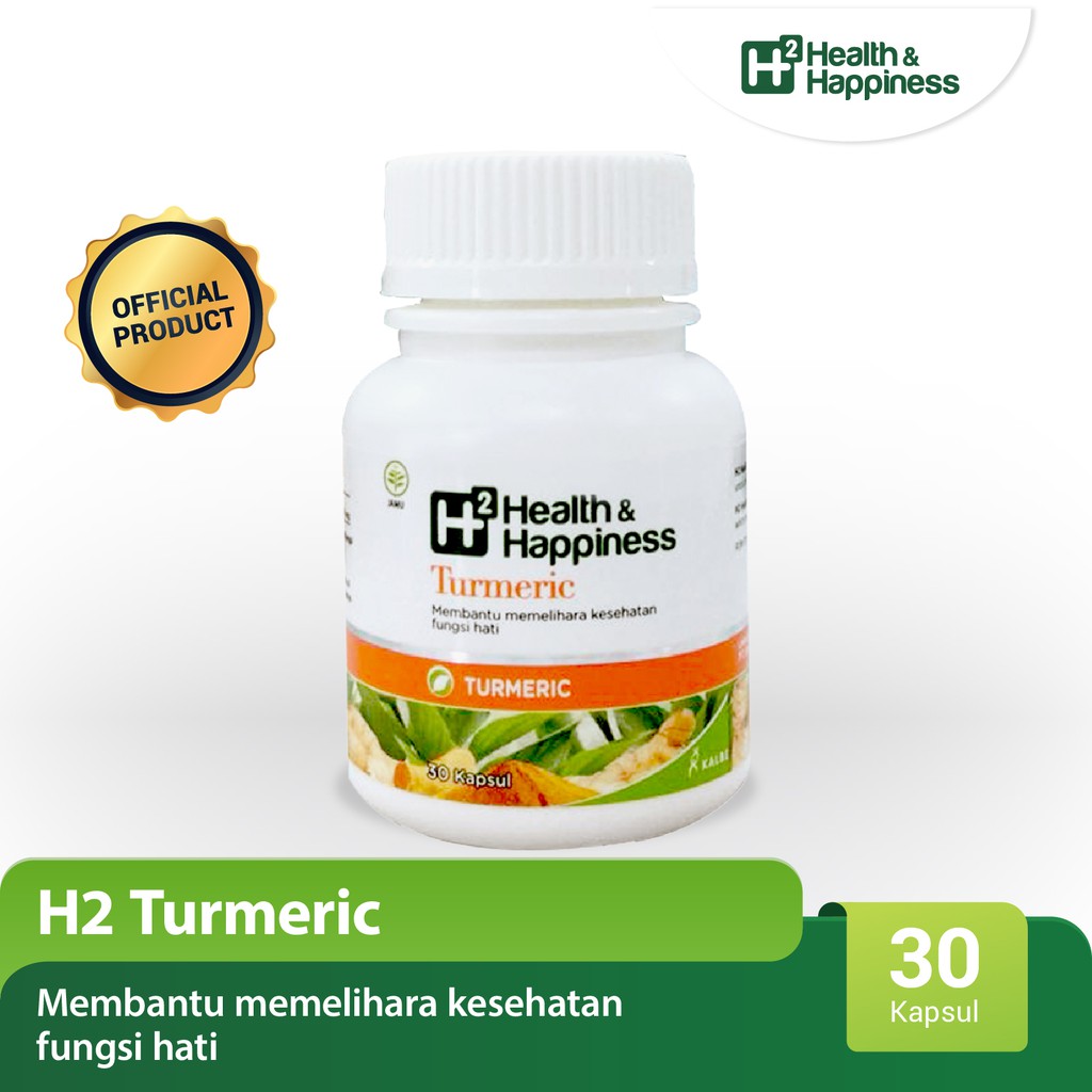 H2 Turmeric merupakan suplemen herbal yang mengandung ekstrak rimpang kunyit (Curcuma domestica rhizoma) yang berfungsi untuk membantu memelihara kesehatan fungsi hati.Spesifikasi:1.Obat tradisional2.Brand H2 Health & Happiness3.Varian H2 Turmeric4.Isi 30 Kapsul5.Tiap kapsul mengandung ekstrak kunyit (Curcuma domestica rhizoma) 350 mgKegunaan:H2 Turmeric berfungsi membantu memelihara kesehatan fungsi hati. Saran penggunaan:Konsumsi 3 kali sehari 1 kapsul