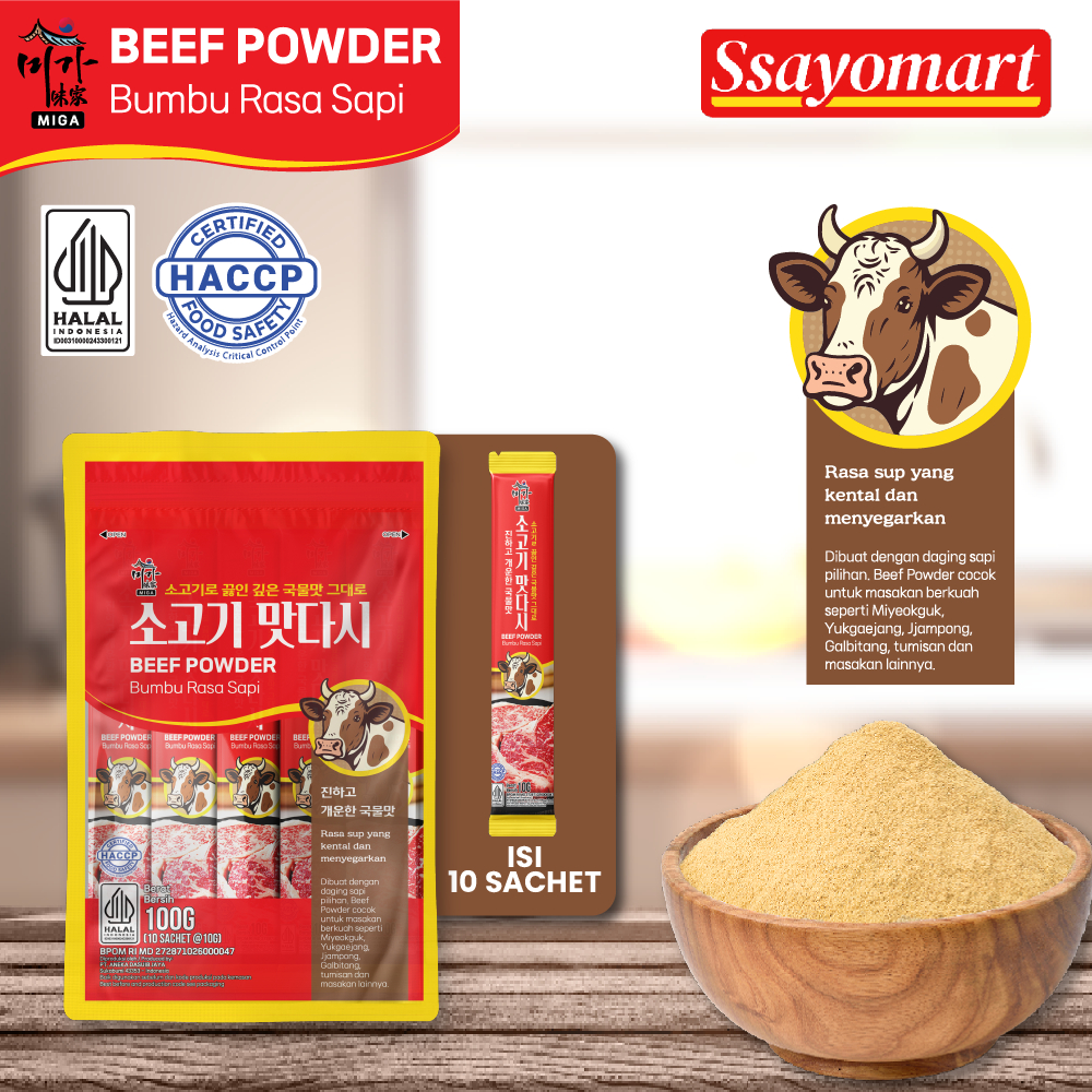 BEEF POWDER dari MIGA dibuat dengan daging sapi pilihan. Beef powder cocok untuk masakan berkuah seperti Miyeokguk,Yukgaejang, Jjampong, Galbitang, tumisan dan lainnya.