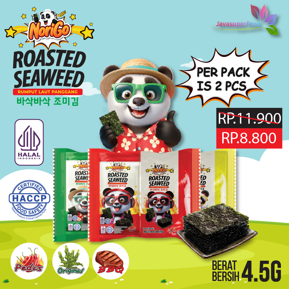 [HALAL] NORIGO DOSIRAK 9GR (ISI 2 PCS) adalah lembaran rumput laut yang dipanggang dengan Minyak Wijen, dimakan sebagai lauk kecil bersama nasi (hangat), atau sebagai makanan ringan (snack).