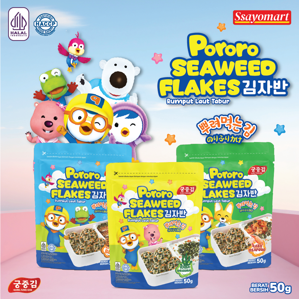 Pororo Seaweed Flakes adalah potongan rumput laut dengan bahan pilihan yang digunakan sebagai taburan (topping) atau tambahan rasa pada makanan yang cocok dijadikan teman ngemil setiap aktivitas, seperti menonton tv, belajar atau bersantai.