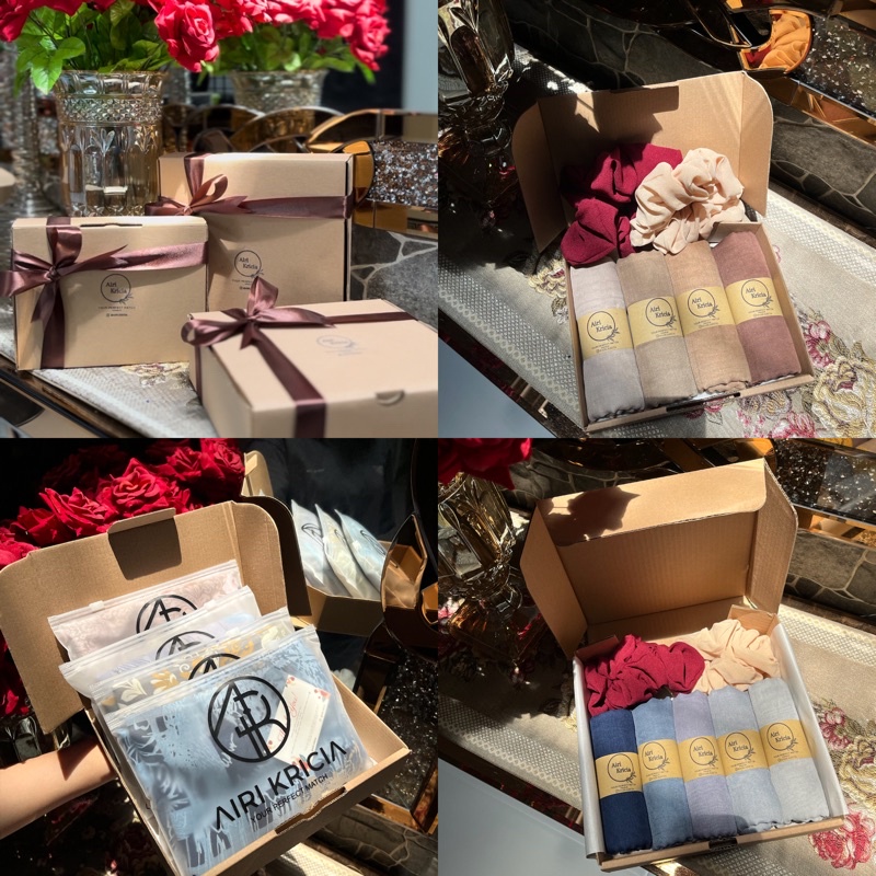 2 jilbab,1scrunchie,card (bisa req) , thankyou card , dan Box