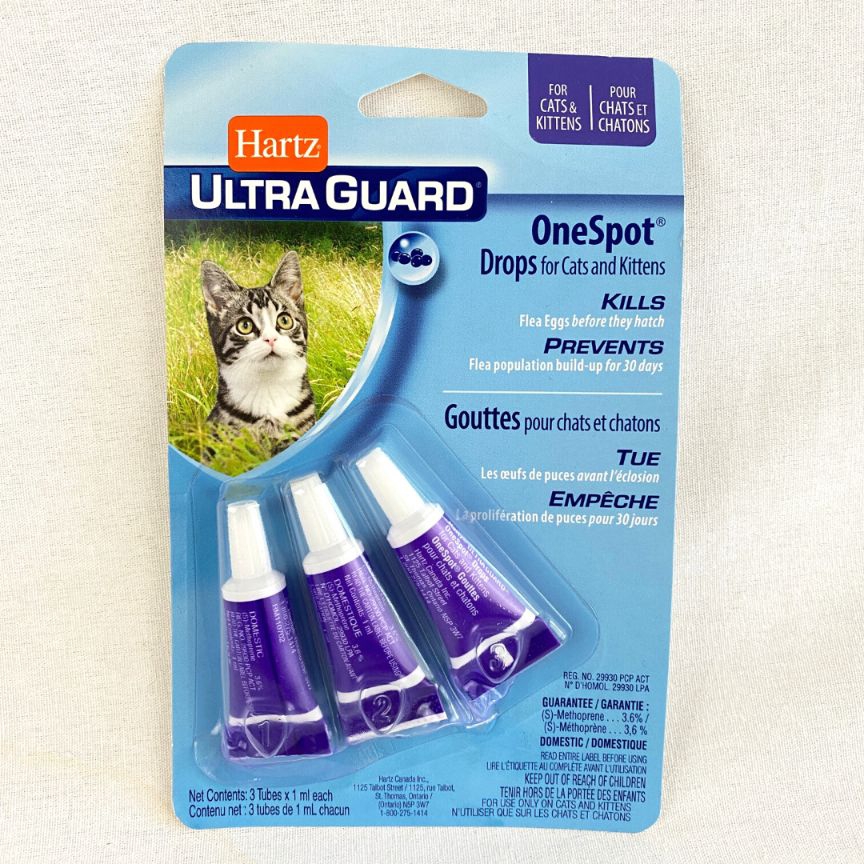Hartz® UltraGuard® OneSpot® Drops for Cats and Kittens stops the flea life cycleby killing and preventing flea eggs and flea larvae for up to 30 days.Directions:Remove one applicator tube from package and hold in an uprightposition. Pull cap off. Turn the cap around and place on top of tube. Press capdown to break the seal of tube. Remove cap carefully. Position the tip of thetube on the cats back between the shoulder blades and squeeze out the entirecontents of the tube. Repeat every month.Ingredients:Methoprene
