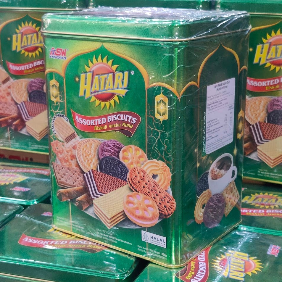 Enjoy a delightful assortment of flavors with HATARI Assorted Biscuit Kaleng, perfect for your festive celebrations.