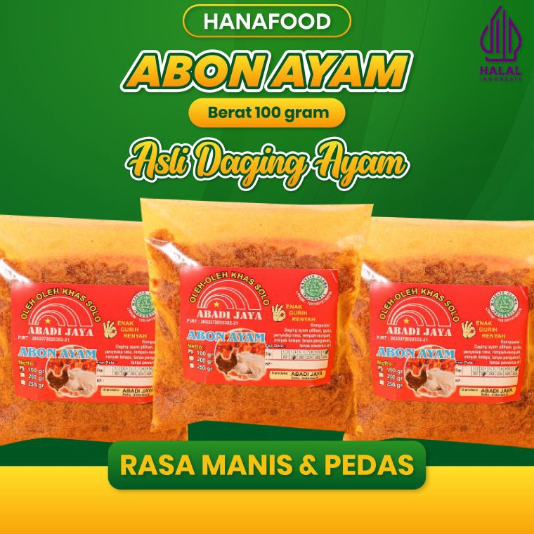 Abon Ayam yang terbuat dari daging ayam pilihan diolah tanpa pengawet dan tanpa pewarna di campur dengan bumbu-bumbu tradisional. Sangat cocok untuk dijadikan lauk pauk sehari-hari dan sangat praktis untuk dibawa kemana saja.
