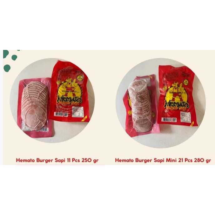 Hemato burger sapi adalah daging sapi giling olahan yang bisa digunakan sebagai isi burger. Hemato burger sapi memiliki tekstur lembut dan rasa daging sapi yang nikmat