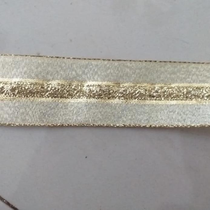 Aksesories Hiasan Natal Ornamen Pita Kain Warna Emas Roll dengan motif renda garis gold glitter.