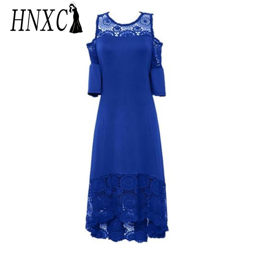 HNXC Вышивка Кружево Пэчворк Большой Размер Женское Платье Расклешенный Короткий Рукав Холодное Плечо Высокая Талия XL синий