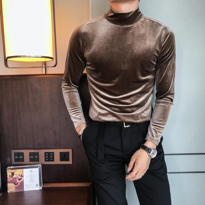 2023 Autumn Half High Collar Solid Color Slim Fit T Shirt Men Long Sleeve Stretch Casual Bottomed Shirt Tee Homme Streetwear